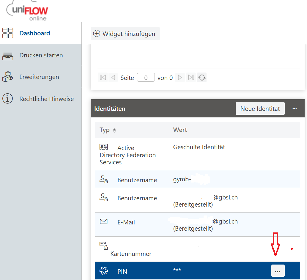 Scrolle ganz nach unten und fahre mit deiner Maus auf PIN, rechts siehst du dann die ... und kannst deine PIN anzeigen. Mit dieser PIN kannst du am Drucker deinen Badge oder deine Karte registrieren.