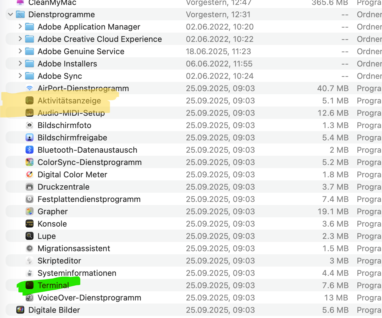 Ich kann mit meinem Mac nicht mehr direkt drucken über uniflow Lösung Wenn deinstallieren und neu installieren nicht hilft, so musst du folgendermassen vorgehen, um ein deep clean zu erzwingen, damit keine alten Installationsdateien zurückbleiben: Oeffne den Finder, gehe zu Programme dann zu Dienstprogramme und öffne die Aktivitätsanzeige (gelb markiert) mit einem Doppelklick. Anschliessend suchst du smartclient, doppelklicke und wähle Sofort beenden. Du befindest dich immer noch im Finder, suche Terminal (im Screenshot oben grün markiert), doppelklicke und gib folgendes ein: sudo bash /etc/smartclient/uninstall-smartclient.bash Gib dein Passwort ein für dein Macbook - es klappt, auch wenn du keine Eingabe siehst. Drücke Enter. Danach kannst du den Druckertreiber über das Dashboard installieren 👉 . Pour les collègues dont le menu de l'ordinateur est en français : vous trouverez ci-joint un mode d'emploi du GBJB à télécharger. Download dieser Anleitung